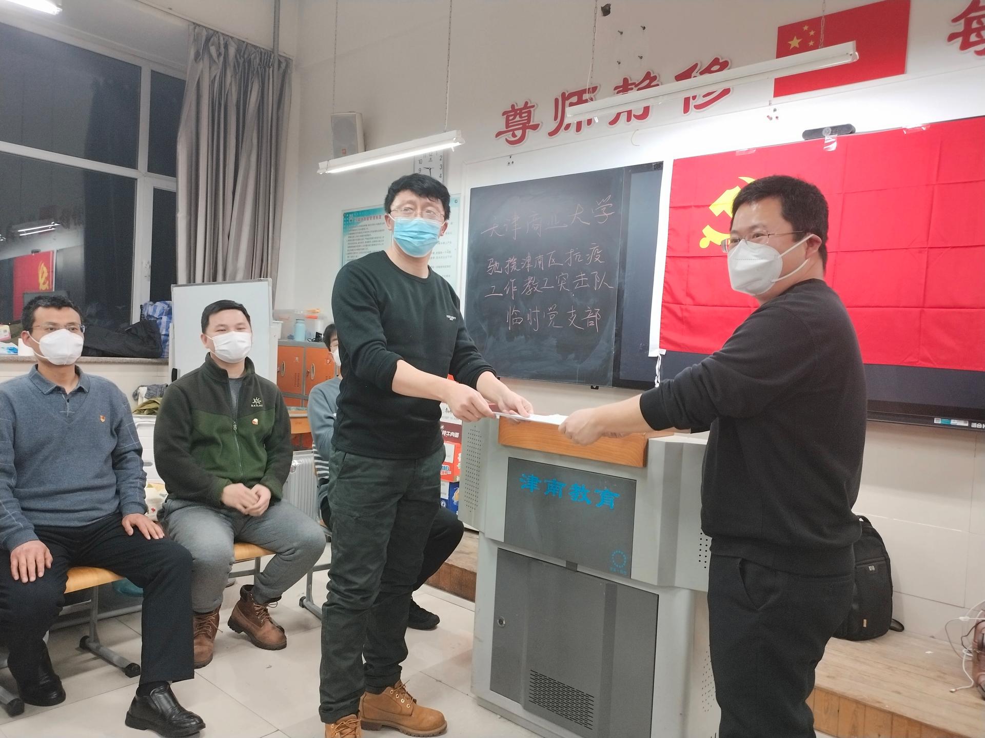 1月18日23时到达驻地后,全体队员随即接受了如何穿脱防护服以及重点防护注意事项等内容的专业业务培训,为第二天快速进入战斗状态奠定了扎实的基础。19日凌晨,999策略白菜手机论坛驰援津南区抗疫工作教工突击队临时党支部成立,下设五个党小组,在抗击疫情前线筑起了坚强的战斗堡垒。在支部书记、突击队领队郭卫中的带领下,快速建立了沟通联络和工作机制,并召开会议及时传达传达市教育两委和学校党委工作部署要求,统一思想、明确目标,开展集体谈心谈话,帮助大家缓解心理焦虑、打消思想顾虑,进一步增强了团队的向心力、凝聚力和战斗力。1月24日晚,学校驰援津南区抗疫工作教工突击队临时党支部开展“弘扬伟大抗疫精神,砥砺初心担当使命”主题党日活动,更加坚定了队员们战胜疫情的信心和决心。突击队队员、体育教学部贾洪祥副教授被党员同志服从安排、纪律严明的政治素质和无畏向前、真心为民的高尚品质深深触动,向党组织递交了《入党申请书》。