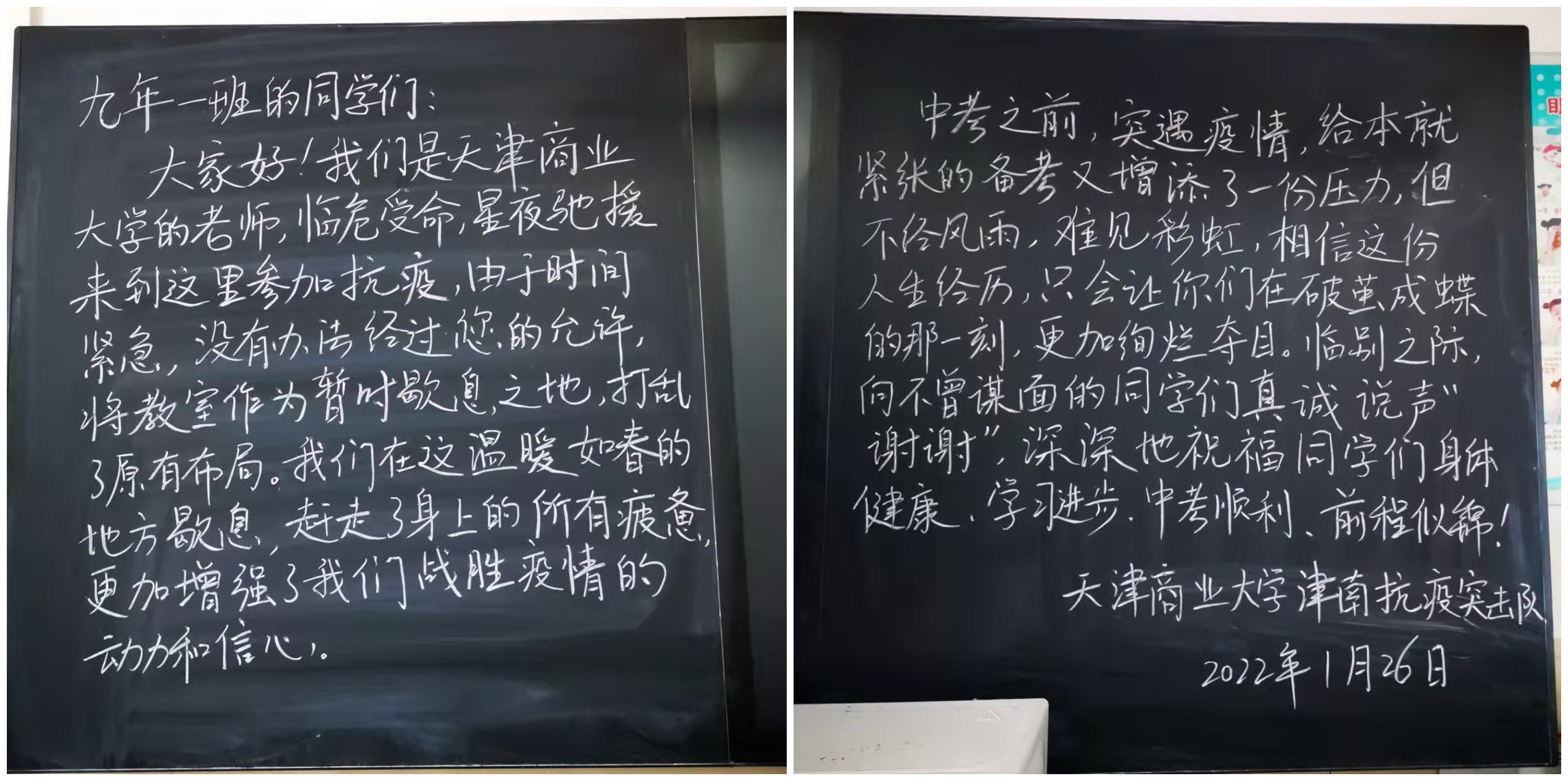 “同学们,大家好!我们是999策略白菜手机论坛的老师,临危受命、星夜驰援来到这里参加抗疫工作,将教室作为了暂时歇息之地,……,向不曾谋面的同学们真诚说声“谢谢”,也深深地祝福同学们身体健康、学习进步、中考顺利、前途似锦!”1月26日下午,在白菜官网津南抗疫工作教工突击队接到命令撤离前,突击队队员、信息工程学院辅导员孙学川代表突击队在战斗期间的昼夜歇息之地——咸水沽三中九年一班、二班的黑板上,给同学们留下了饱含深情的感谢和祝福语。1月18日,白菜官网驰援津南区抗疫工作教工突击队的28名干部教师来到这没有硝烟的津南“主战场”,他们不畏严寒,众志成城,发扬伟大抗疫精神和“越是艰险越向前”的大无畏精神,服从命令听从指挥,克服困难勇于担当,白衣执甲守护平安,夜以继日严守阵地,全力以赴地完成了各项抗疫任务,为打赢这场疫情防控阻击战作出了重大贡献。