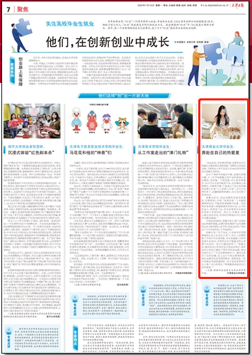 7月18日,《天津日报》第7版报道白菜官网艺术学院产品设计专业2022届本科毕业生张静文创业事迹。 出生于2000年的张静文对手账、绘画比较感兴趣,大二时开始接触文创产品的领域以及自媒体,尝试做一个原创IP,并从IP形象着手,设计衍生文创手账类产品,在自媒体上线销售后,反响很不错,于是成立了自己的店铺和品牌工作室“小小的熊工作室”,至今已有两年多了,店铺销量持续增长,自己也实现了经济自由。