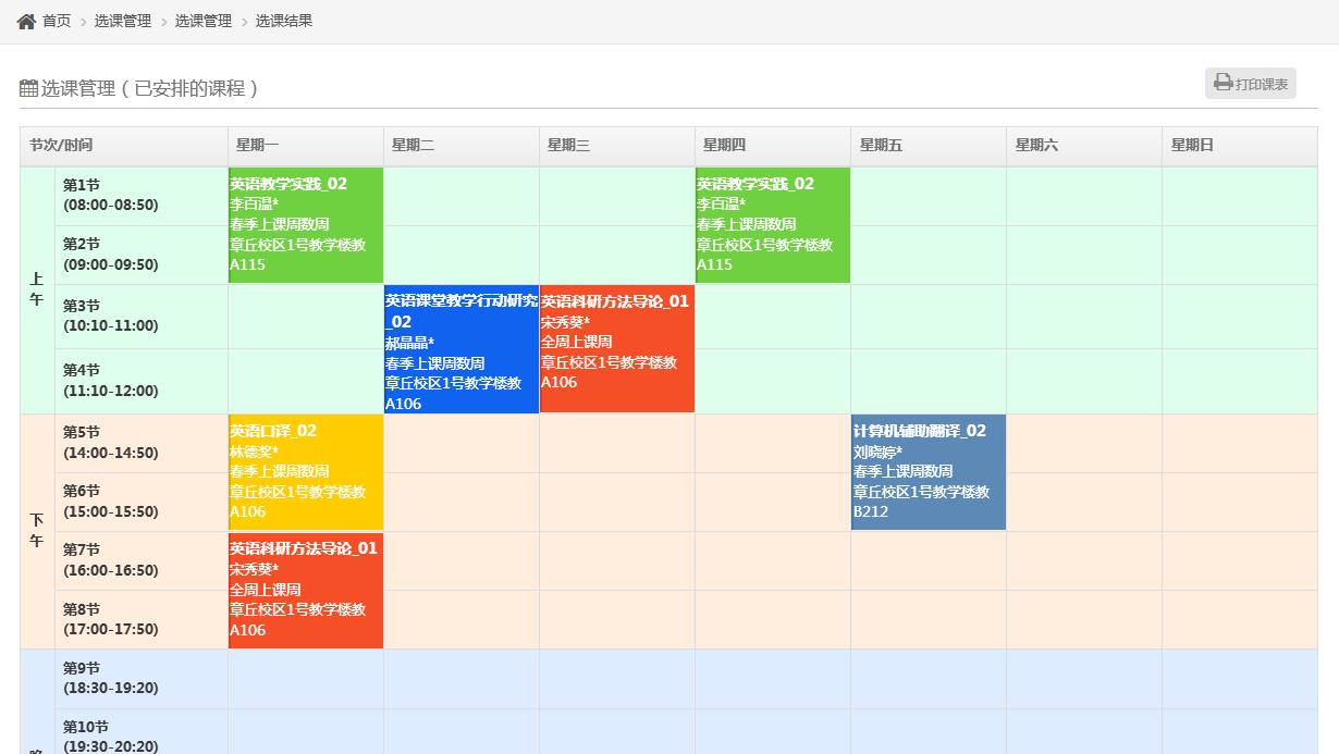 补退选结束后,学生可自行上网浏览、核对、打印自己的课程表,并按课表上的时间安排上课。
