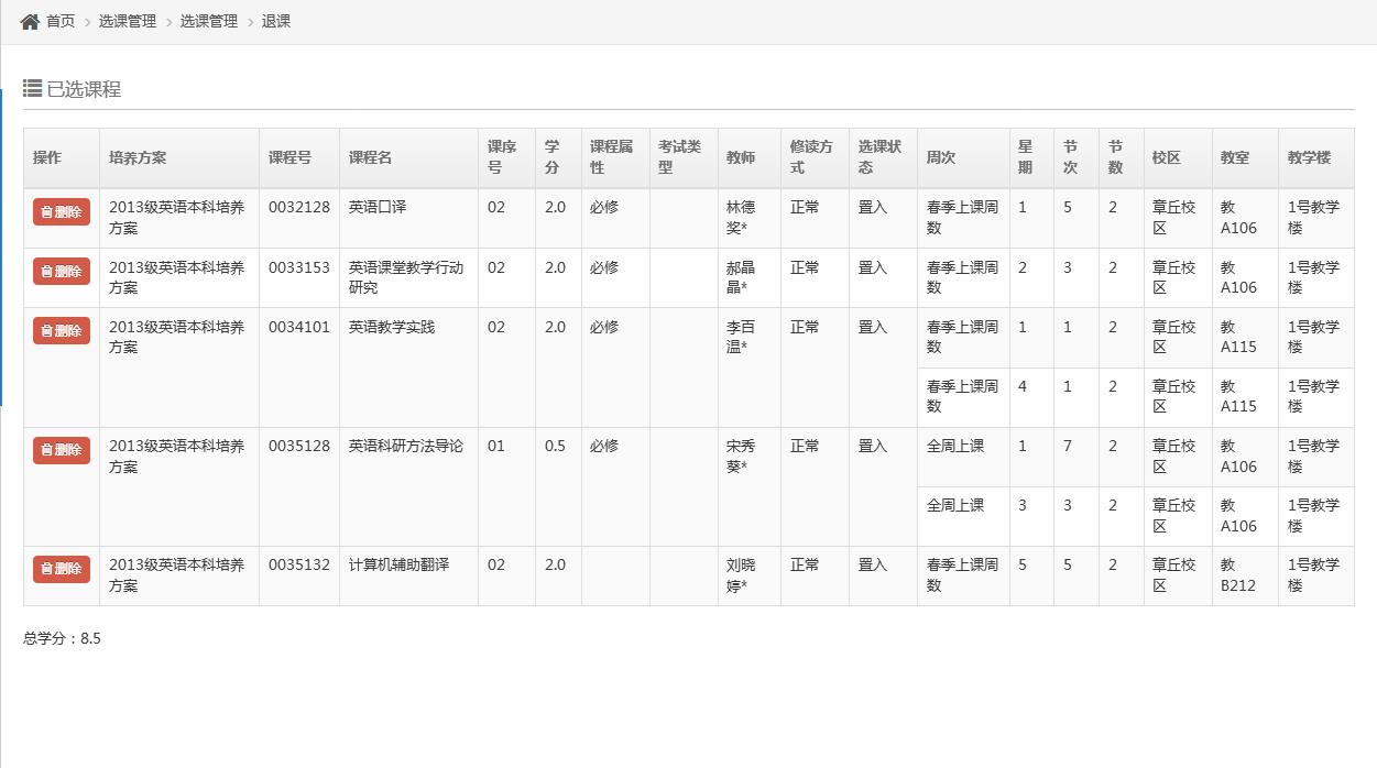 进入【退课】页面,学生可对已选择的课程进行删除操作,注意不可删除已置入的必修课。