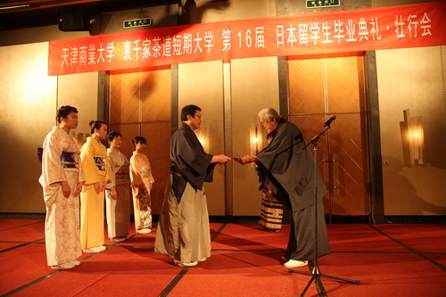送行会上,市外办副主任杨国彪代表天津市对外友好协会会长、天津市副市长任学锋为千玄室大宗匠先生颁发了“天津市人民友谊特别贡献奖”,千玄室大宗匠先生和刘书瀚校长分别在会上讲话。
