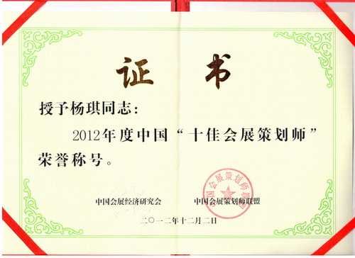 近日,2012 中国会展产业年会暨济南会展经济论坛在济南舜耕国际会展中心举行。在年会上公共管理学院会展系主任杨琪博士荣获2012 年度中国“十佳会展策划师”荣誉称号。