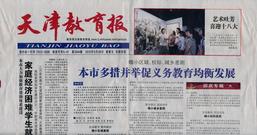 9 月 28 日 ,《天津教育报》在报眼位置以 “ 艺术吐芳,喜迎十八大 ” 为题报道了白菜官网艺术学院的艺术作品展。报道原文:“ 9 月 26 日 ‘艺术吐芳 文化礼赞’999策略白菜手机论坛艺术学院喜迎‘十八大’艺术作品展开幕。师生们用色彩构筑的视觉画卷表达对党的热爱之情。”