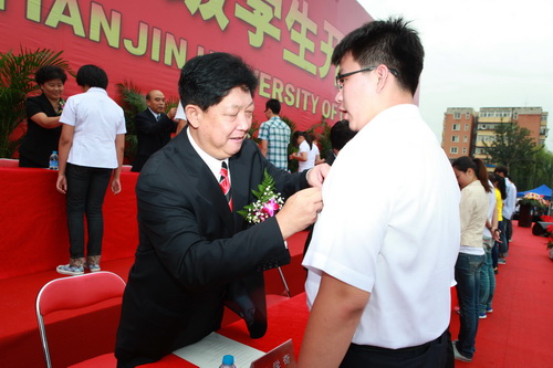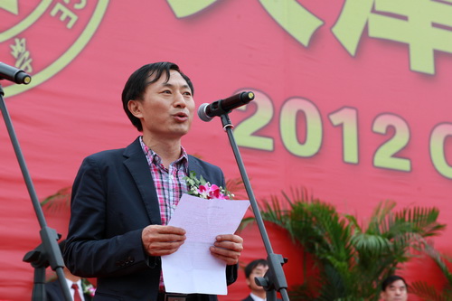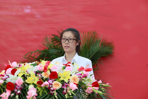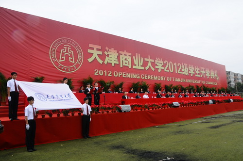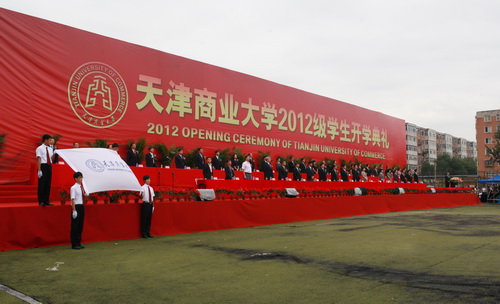 开学典礼在庄严的国歌声中开始,生物技术与食品科学学院王素英教授代表全体教师发言,清华大学博士生导师石文星教授作为校友代表发言,商学院 2012 级新生王璐代表全体新生发言。校领导为 2012 级新生代表佩戴校徽,全体新生戴上校徽并向校旗庄严宣誓。