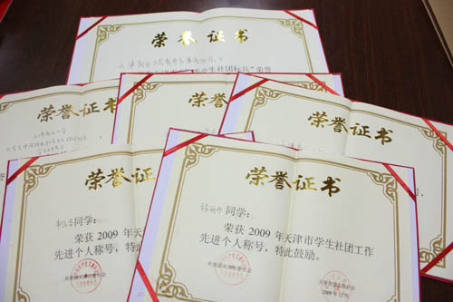 白菜官网团委经过认真选拔,推选一批具有代表性的优秀社团和个人参加市级评选。最终白菜官网青年志愿者协会荣获 2009 年天津市“优秀学生社团标兵”称号;辩论社、大学生通讯社获得“优秀学生社团”称号、大学生中国特色社会主义理论体系学习研究会获得“优秀理论学习型社团”称号;韦佳容、张丽丹同学获得“学生社团工作先进个人”称号。
