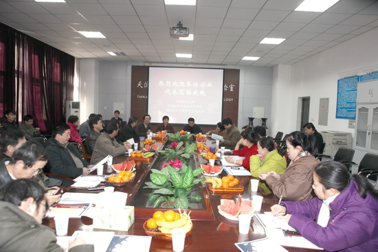 12 月 18 日上午,为进一步贯彻学校办学指导思想和特色人才培养战略,加强学校与企业的交流,为 2010 届毕业生搭建就业平台,生物技术与食品科学学院与学院会议室召开了首届人才培养校企座谈会。共邀请到天津海河乳业、天津中辰番茄制品有限公司、天成制药有限公司、天津乐仁堂制药厂和桂顺斋等 25 家优秀企业相关负责人到会。学校招生就业办、学院领导与部分教师及毕业生代表30余人参加了此次座谈会。校党委副书记杨万义亲临会场并讲话。学院党总支副书记孙文利主持座谈会。