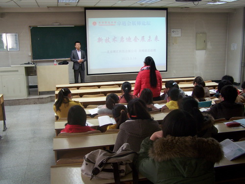3 月 19 日 下午,公共管理学院会展系举办“卓越会展师论坛”活动,邀请北京博汇创景科技会展公司副总经理吴峰来白菜官网做题为“新技术启迪会展未来”的专题讲座,卓越会展师实验班的全体学生与吴总进行了交流。讲座由会展系主任杨琪博士主持。