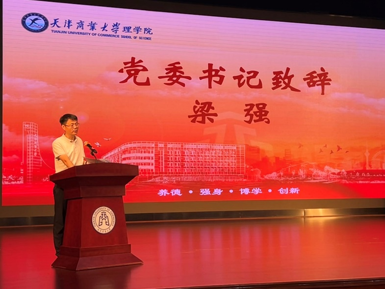 学院党委书记梁强首先致辞,他欢迎同学们加入天商理学院大家庭,详细介绍了学校、学院的发展历史,向同学们提出天商的“大学三问”:大学是什么、大学学什么、大学毕业后干什么。结合实际讲解了学院培养人才、促进新生成长所搭建的各类平台。最后,希望新生们在天商历练成长,学有所成、研有所进,以最好的青春、最美的奋斗与天商相遇。