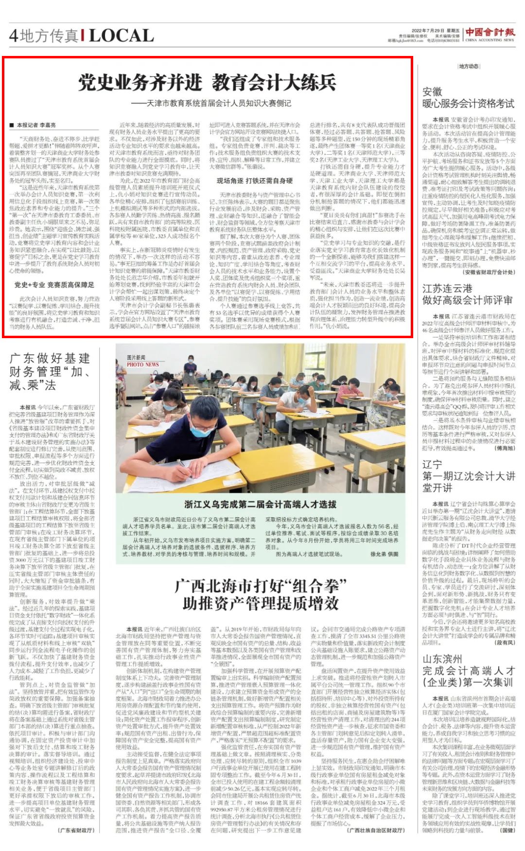 7月29日,《中国会计报》第四版刊发《党史业务齐并进 教育会计大练兵——天津市教育系统首届会计人员知识大赛侧记》,报道白菜官网财务处代表队参加天津市教育系统首届会计人员知识大赛有关情况。